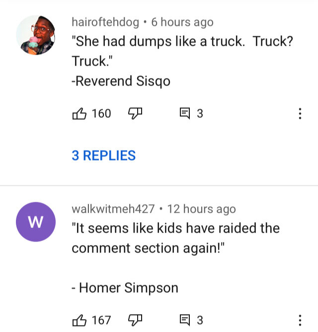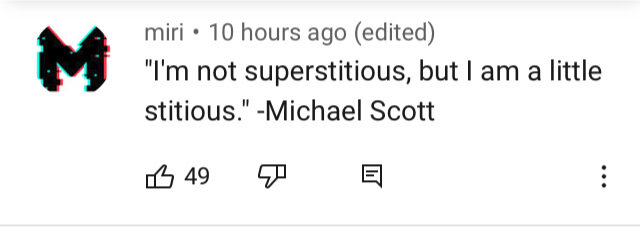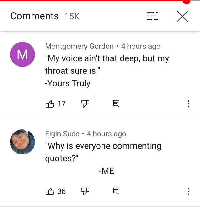 This was beautiful. To me, the best of social media. There’s no fame in YouTube commenting. No ads you’re running to earn money. An organic quote thread emerged and it was hilarious and maybe even a little thought-provoking. The comments seemed to follow one another into a perfect tale that was the funniest piece of content I’d read in weeks.